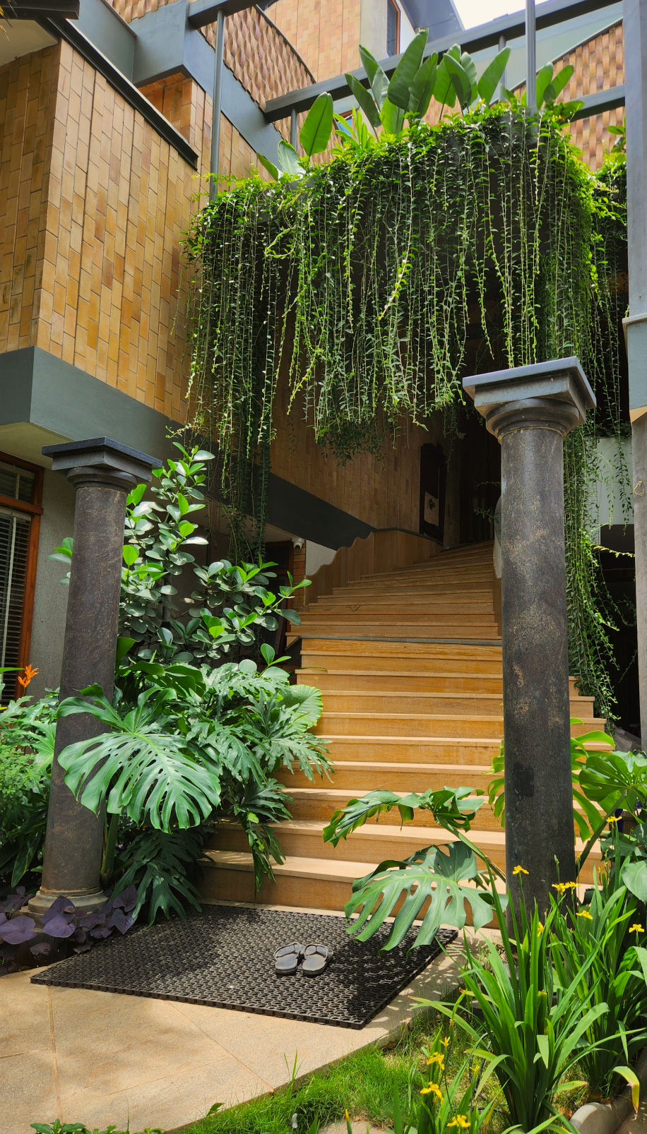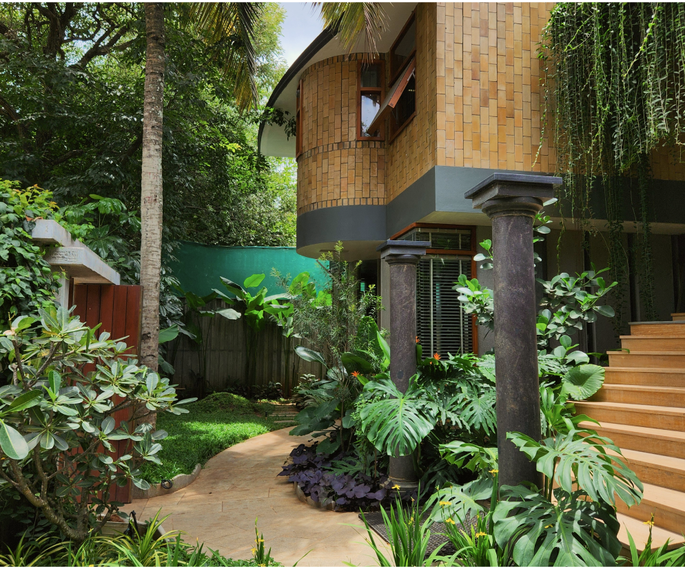 That’s when Art Yard was invited to collaborate. Guided by Project Architect Shruti, the brief was clear: create a tropical paradise around the residence, with lush greenery that resonates with the home’s sustainable ethos. Our team carefully studied the architectural style and the site, then designed and executed a landscape that brought the tropics alive with vibrant plant palettes, layered textures, and immersive outdoor spaces that flow effortlessly with the house.